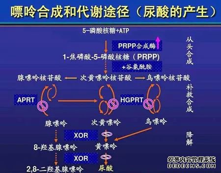 (1)人体细胞内蛋白质分解代谢产生的核酸和其它嘌呤类化合物,经一些酶的作用而生成内源性尿酸。