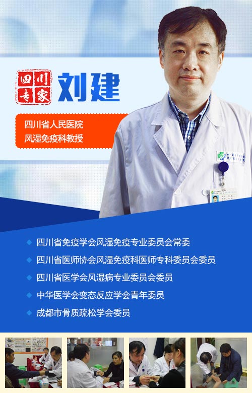 刘建主任1993年毕业于重庆医科大学临床医学系。从事风湿免疫专业临床工作10余年,擅长类风湿关节炎、脊柱关节病、痛风等各种骨关节疾病及各种血管炎;系统性红斑狼疮、干燥综合症、多发性肌炎、皮肌炎、系统性硬化症等弥漫性结缔组织病的诊治。