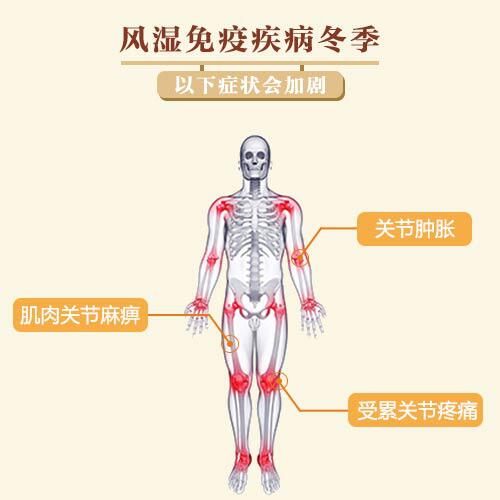 1、受累关节疼痛:是患者的一种自觉痛苦的症状,是风湿免疫疾病中较常见的症状。风湿免疫疾病的主要表现在肢体的关节、皮肤、肌肉、经脉等。痛风、强直性脊柱炎、风湿性关节炎、类风湿性关节炎等疾病,均以作为主症,冬天这些受累关节受到寒冷后就会加剧疼痛感。