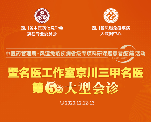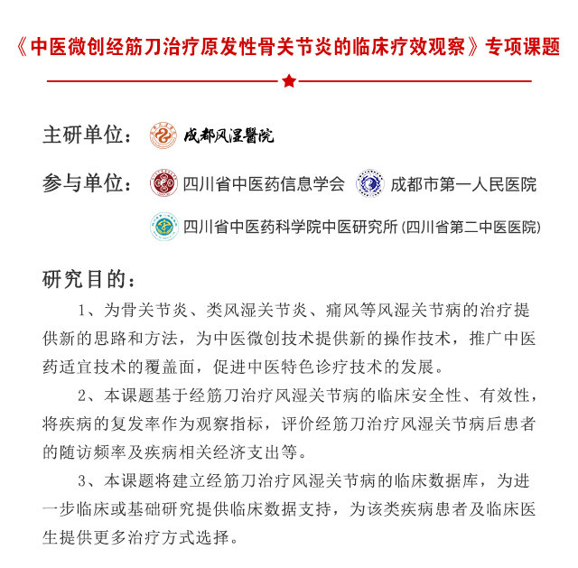 2020年11月27日,四川省中医药管理局公布了2020年度中医药专项课题立项名单,我院申报的课题《中医微创经筋刀治疗原发性骨关节炎的临床疗效观察》,经过审核,成功立项。鉴于冬季风湿免疫疾病防治严峻形势,为提高风湿免疫疾病患者的临床精准诊疗,早日摆脱致残风险,四川省中医药信息学会痹症专业委员会、四川省风湿免疫疾病大数据中心紧急启动中医药管理局·风湿免疫疾病省级专项科研课题征集200名风湿免疫疾病患者,并于12月12日-13日对符合本项科研条件的患者给予专项课题补贴。