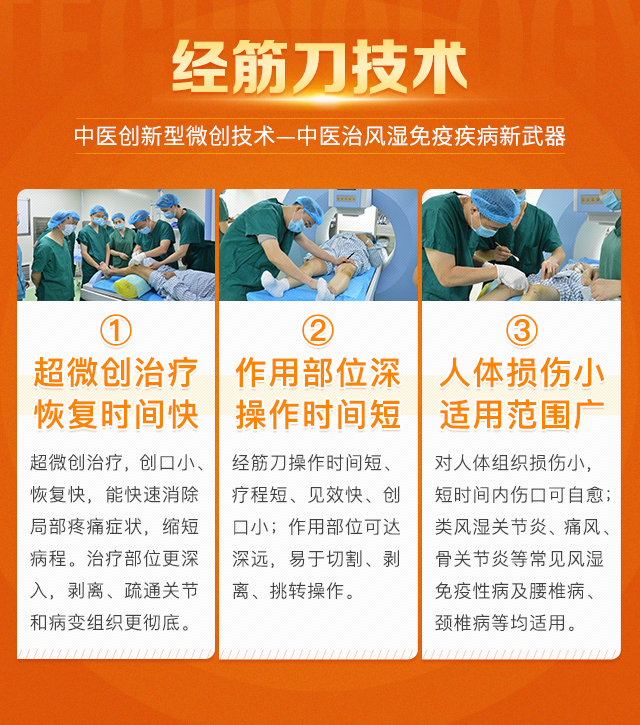 经筋刀源于古法“九针”之长针,采用与人体相溶性较好的高品质钛合金材料,取其锋利身薄特点,将长短相伍,利钝相合,准确定位,点线面体循筋辨证施治,根据病人的症状、体征疏通筋脉。根据疼痛部位,按照十二经筋循行,辨别发病经筋,在经筋线上寻查虚实经筋结点;根据症状体征,借助影像设备进行可视操作,采取远近结点结合,于经筋循行下端进行治疗;辨别相互关联多条经筋,数筋并重同时治疗。运用经筋八法,使横络松解,经气通畅,恢复组织通道生理功能,风湿诸症得以缓解。
