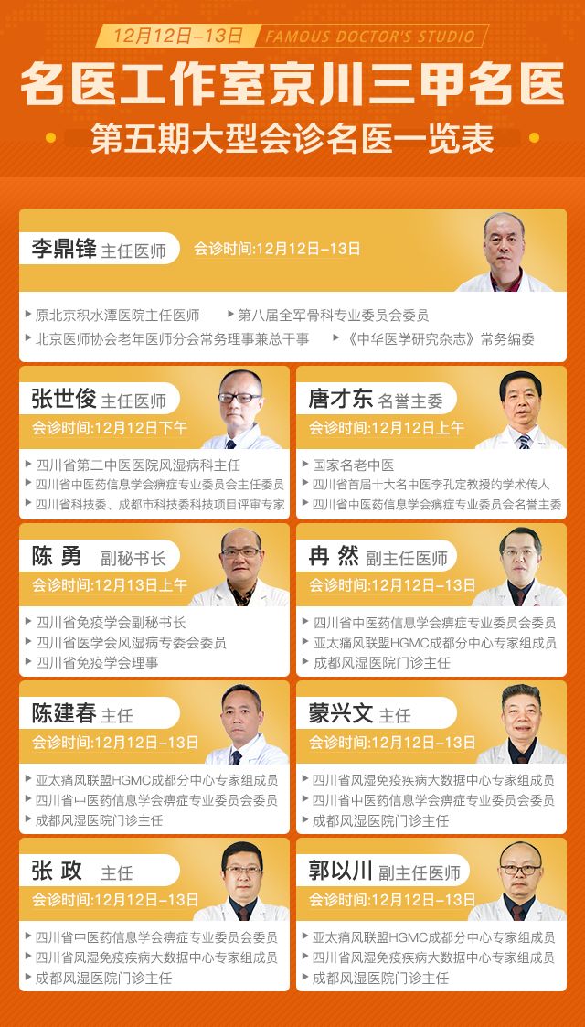 同时,为帮助痛风、类风湿、风湿、强直等风湿免疫疾病患者摆脱疾病反复发作带来的痛苦,提高生活治疗,降低致残风险,在四川省中医药信息学会指导下,由四川省中医药信息学会痹症专业委员会主办的四川省风湿免疫疾病名医工作室,将于12月12日-13日在我院同步开展名医工作室京川三甲名医第四期大型会诊。届时,由原北京积水潭医院李鼎锋领衔,四川省第二中医医院张世俊、四川省中医药信息学会痹症专业委员会唐才东名誉主委、四川省免疫学会陈勇副秘书长等风湿免疫疾病专家/医师联合会诊,制定针对性规范化的个体化治疗方案,保障高效临床诊疗效果,有效开展成都乃至四川地区患者的防治工作,增加患者的康复信心,帮助患者在这个冬季得以康复!