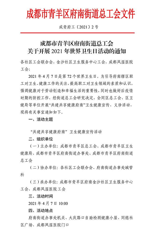 为积极响应成都市青羊区府南街道总工会、金沙社区卫生服务中心工会、区卫健局“共建共享健康府南”卫生健康宣传活动的号召,我院党支部联合院工会组织开展健康义诊活动,向广大群众提供风湿骨关节疾病相关问题健康宣传服务,并发放健康宣传资料。
