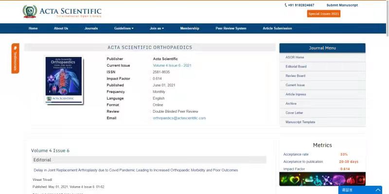 图:《ACTA SCIENTIFIC ORTHOPAEDICS》杂志官网刊登我院SCI论文