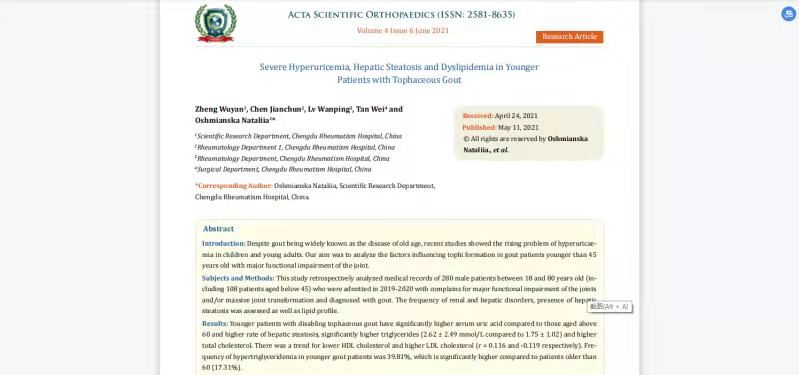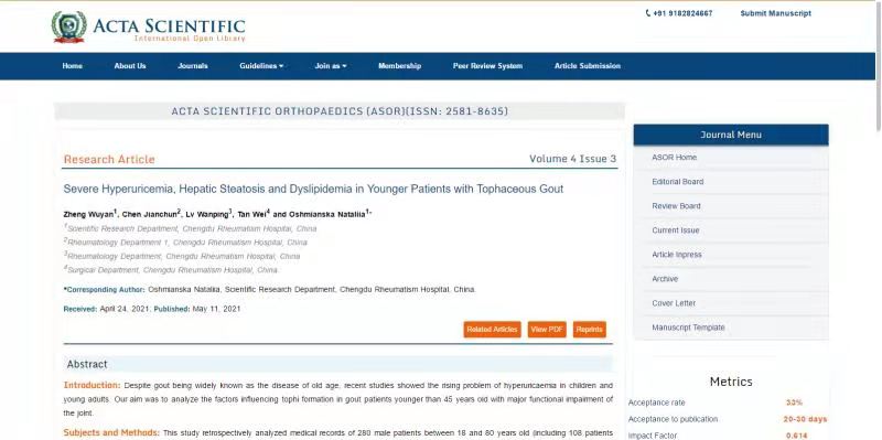 日前,成都风湿医院科研工作再次传来喜讯,由陈建春主任、吕万萍、谭巍以及科教部科研员乌克兰医学博士Nataliia Oshmianska(娜塔莉娅·奥什米安斯卡)联合撰写的《严重高尿酸血症,肝脂肪变性和血脂异常的年轻痛风石患者的治疗经验》在《ACTA SCIENTIFIC ORTHOPAEDICS》杂志成功发表,并被SCI收录,影响因子0.6分。