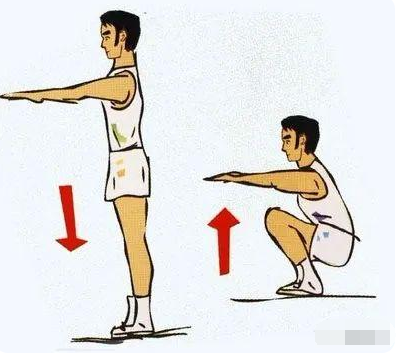 检查方法:双手抱头,双足并拢,双足跟踮起,挺胸收腹,上身保持正直,进行深度下蹲。