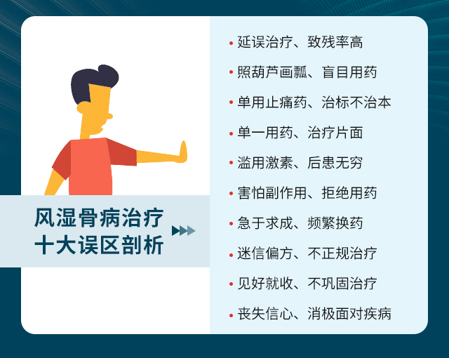 经济和医疗水平的局限让很多患者得不到规范治疗或中途放弃了治疗。在临床上,有44%的风湿骨病患者得到了比较规范的治疗,而44%的患者中有很大一部分患者只针对第一阶段的止痛进行了干预,并未真正做到风湿骨病抗复发治疗。究其根本,病情得不到控制,在于缺乏合理治疗;久治不愈,在于治疗方案不对症,没找对医生。