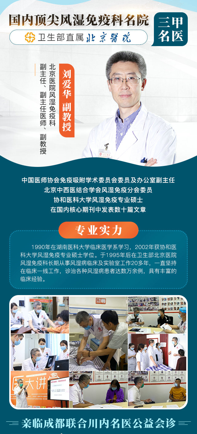 为了让川内更多风湿骨病患者能得到及时、专业的治疗,四川省风湿骨病“名医工作室”专家组特邀卫生部直属北京医院风湿免疫科刘爱华副教授莅临成都,共同对风湿骨病患者提供公益面诊、多对一诊疗,对患者病情详细分析、精准评估,制定个体化、规范化“治痛防残抗复发”诊疗方案,帮助患者早日摆脱疾病困扰、避免残疾风险。