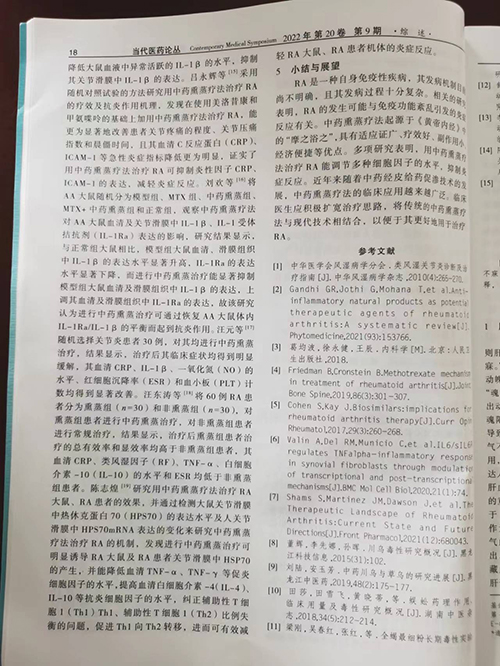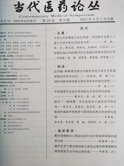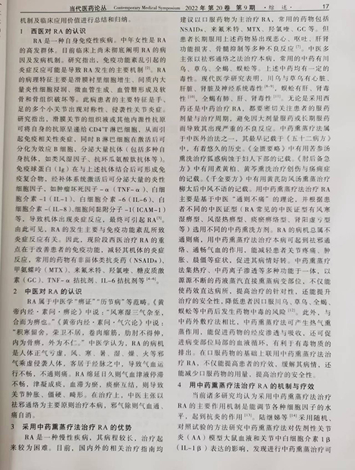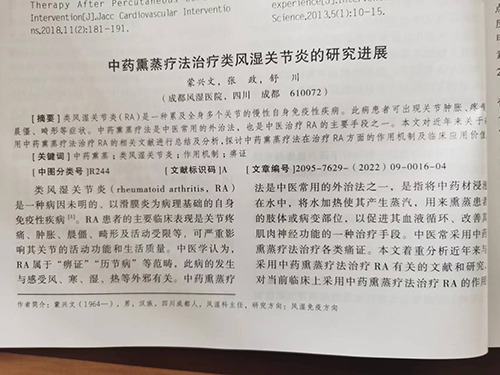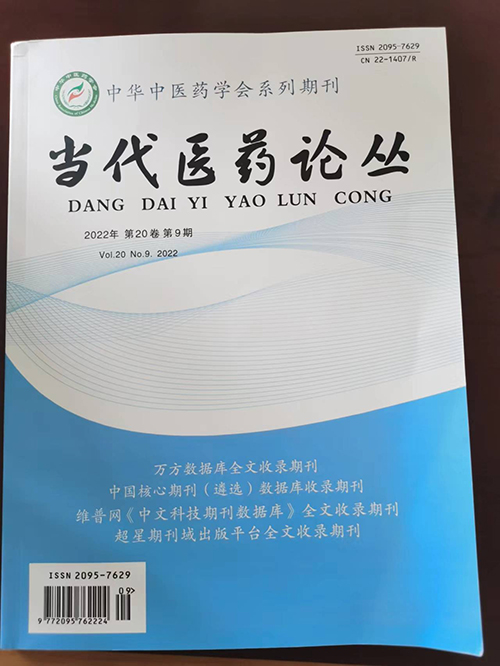 近日,我院收到中华中医药学会系列期刊《当代医药论丛》杂志样刊,蒙兴文主任、舒川等专家联合撰写的论文《中药熏蒸疗法治疗类风湿关节炎的研究进展》,已被中华中医药学会系列期刊《当代医药论丛》杂志2022年第20卷第9期收录并已于5月1日实物出刊,同时被知网总库、万方数据库收录。