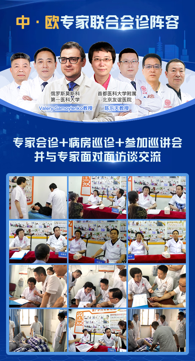 2、中·欧医生联合会诊+病房巡诊:Valery Samoylenko(萨莫伊连科·瓦列里)医生、陈乐天医生与我院陈建春主任、陈建春主任、蒙兴文主任、马友文主任、陈南平主任等医生医生为患者进行联合会诊、病房巡诊,并制定专属治疗方案。
