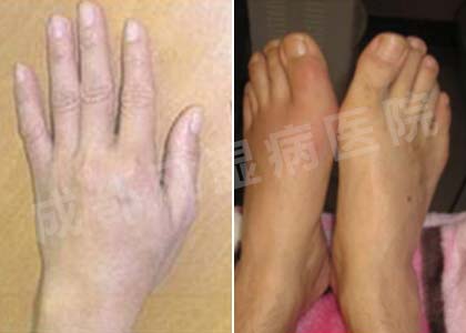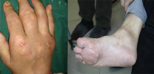 (图:治疗前,患者手指与脚部关节均有痛风石,患处皮肤肿亮)