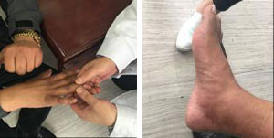 (图:达先生的双手、双踝红肿明显,有大小不等的痛风石)
