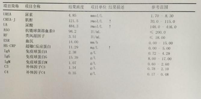 查血:超敏C反应蛋白 11.29mg/L,肌酐值121.5umol/L,血沉14mm/h,血尿酸484.3μmol/L。