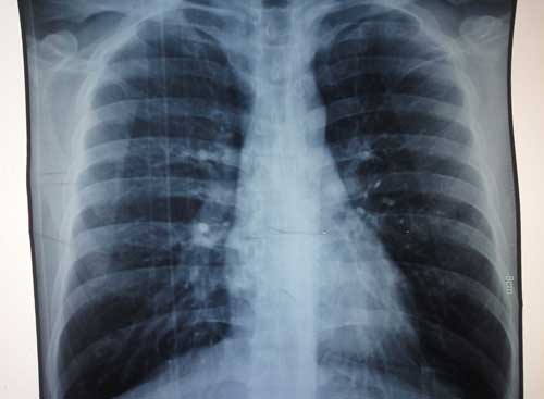 X线片示:双肩关节间隙狭窄,骨质受损,胸锁处有异常凸起。