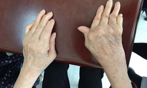 患者自诉双手指关节变形40+年,患病初期感觉双手有些疼痛,后出现膝关节红热胀痛现象,连走路、上下楼梯膝盖都弯不起来。感觉影响正常生活后,吴奶奶就去当地医院检查,医生给出的诊断结果显示吴奶奶患上类风湿性关节炎。