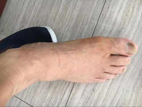 (图:患者周先生治疗前右足第一跖趾关节疼痛,红肿明显)