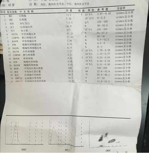 实验室检查结果:尿酸573umol/L;C-反应蛋白9.4mg/L;血沉3mm/h;白细胞10.5;中性细胞数7.27,多种指标均显示不正常。