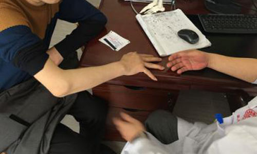 (图:陈建春主任为宋元忠检查手部关节情况)