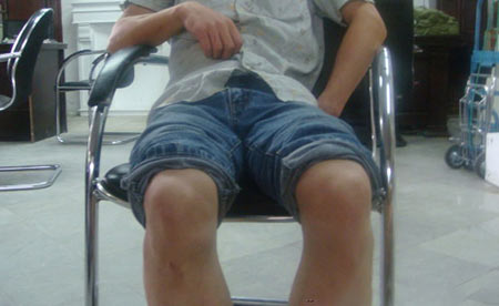 (图:刘先生治疗前膝关节肿痛,无法下地行走)