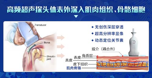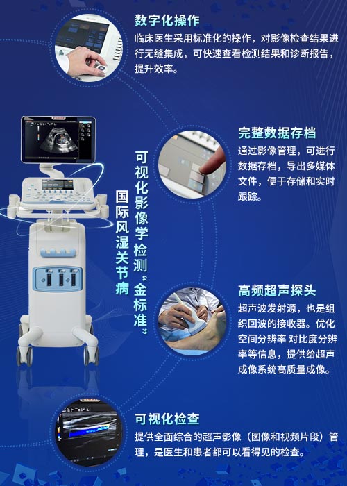 2、无创无痛、操作安全便捷。MSUS无明确禁忌症,无放射性损伤,检查无创无痛苦,实现了安全便捷操作,可以在床旁、手术室、急诊室实时动态检测,检查时可同时进行医患之间的互动与交流,极大的提高了对治疗的全方位实时治疗情况跟踪,易于康复。3、可视化检查。高性能探头发射超声波束并接收散射的回波,组织增强成像和XView算法处理等较新成像技术,提供优异的高分辨率影像。全程处于“可视化”操作状态下,对患者病情做出准确评估,同时对处于康复过程中的患者也能进行实时有效的监测。4、实现多关节部位同步检查。MSUS可一次对多个关节进行检查,能迅速获得结果,对于多关节病变省时而高效;而且MSUS易于双侧关节对比检查,便于发现某些细微的病变。