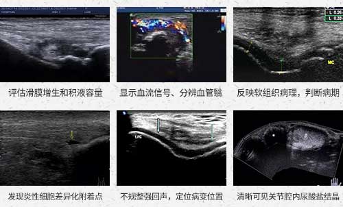 肌骨超声以高频超声实时成像的方式,在静态和动态下对关节结构进行可视化的观察,通过高频超声穿透软骨、关节间隙及破坏的骨质,清晰地显示骨关节面、关节间隙、软骨等解剖结构;准确识别各关节的滑囊病变,关节腔积液、滑膜增生和炎症反应;关节滑膜腔内痛风石的形成和尿酸盐结晶的沉积、关节及骨表面的侵蚀破坏情况等,为滑膜炎、骨破坏、关节腔积液等病变提供了客观的依据。肌骨超声可同时重复检查多个关节,便于动态监测,有利于临床医生对病情做出精准评估。肌骨超声检测风湿关节病五大优势: