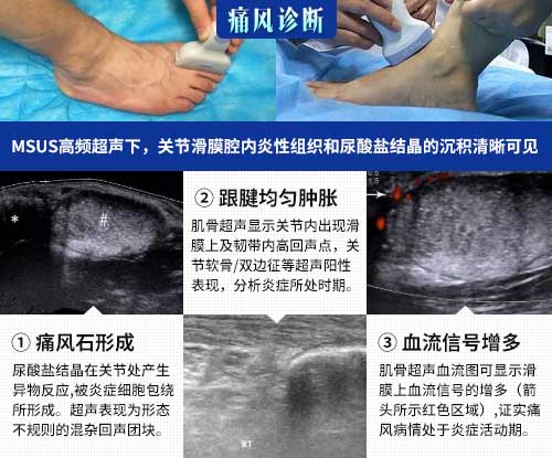2、肌骨超声在痛风性关节炎的应用:痛风是由于遗传性或获得性病因导致嘌呤代谢紊乱和(或)尿酸排泄减少引起的一组疾病,是尿酸钠或尿酸盐结晶从超饱和的细胞外液沉积于组织所致的一种或多种病变的临床综合征。早期诊断治疗能改善关节破坏,延缓肾脏损害进程。肌骨超声能清晰反应尿酸踪迹变化,辨别滑膜上血流信号的增多、形态不规则的混杂回声团块;发现痛风性关节炎受累关节的骨侵蚀、关节积液、滑膜增生、关节周围滑囊积液、关节内片状强回声团伴声影、关节软骨/双边征等超声阳性表现;显示关节内出现痛风石、平行线、滑膜上及韧带内高回声点,分析关节炎症处于哪个时期。肌骨超声对痛风不同病期的诊断发挥了重要作用。