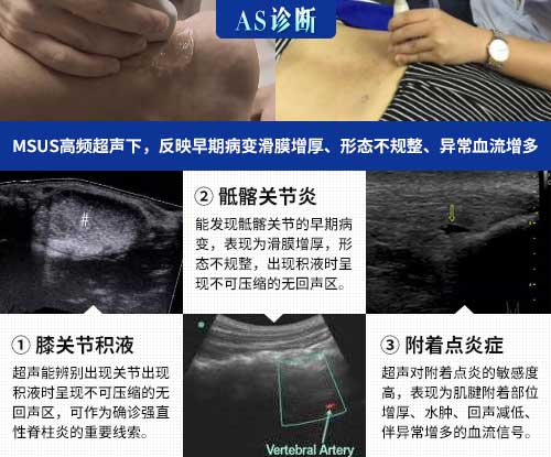 3、肌骨超声在强直性脊柱炎的应用:强直性脊柱炎是与HLA-B27高度相关的脊柱炎关节病,其基本病理改变是肌腱端炎,是肌腱或韧带的炎症反应导致炎性渗出增多,炎性细胞聚集,较终出现局部的纤维化和骨化。肌骨超声对附着点炎症的敏感性高,能显示出肌腱附着部位增厚、水肿、回声减低,伴异常增多的血流信号,还能显示骨质侵蚀、不规则、钙化形成等病变。对于初始起病关节的骶髂关节的诊断能及时发现早期病变的滑膜增厚、形态不规整、异常血流增多,是诊断强直性脊柱炎的重要线索。