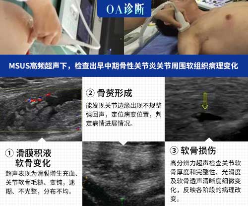 4、肌骨超声在骨性关节炎的应用:骨关节炎是较为常见的关节退行性疾病,其较早的病理改变是软骨纤维样变,出现裂隙,随后又发生软骨分解,软骨内水含量和细胞对基质的比例降低从而引发关节炎症。肌骨超声对于早中期骨性关节炎患者关节周围软组织的病理变化可很好的显示,能更好地定位病变位置,发现早期病变。通过高分辨力超声检查关节软骨厚度和完整性、软骨表面轮廓的光滑度及软骨透声清晰度细微变化,可以较好地反映骨关节炎各阶段的病理改变,同时超声对于骨关节炎滑膜增生/肥大、滑囊积液、肌腱/韧带肿胀及关节周围组织的改变敏感度高、检出率高达97.6%。
